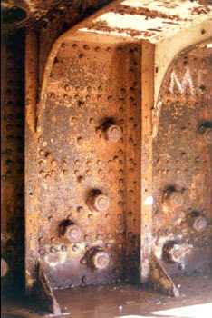 The keel is composed of two flat plates, strengthened by a continuous vertical keelson. There are also four longitudinal frames, composed of steel plates, running fore and aft the vessel on each side of the keel, the upper longitudinal forming the shell or recess for armour. The remainder of the hull is built of iron."7