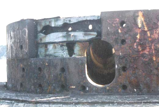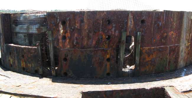 "To be 10 inches thick on the front, and 9 inches on the back as shown upon the Plan of Turret, the Plates to be worked horizontally and fastened with Iron Bolts 3½" diameter having conical heads."1 [The ten inch armour is only immediately around the gun ports with the rest of the turret having nine inch armour. Observation indicates that there are two strakes of armour]