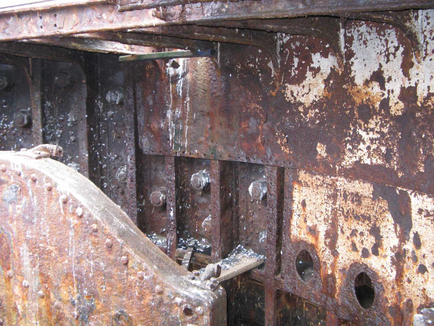 The keel is composed of two flat plates, strengthened by a continuous vertical keelson. There are also four longitudinal frames, composed of steel plates, running fore and aft the vessel on each side of the keel, the upper longitudinal forming the shell or recess for armour. The remainder of the hull is built of iron."7