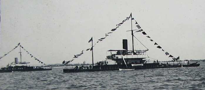 The vessel is armed with four 18 ton guns, two in each turret, both of which revolve. The four guns were first discharged with scaling charges. Then the left gun in the fore turret was loaded with a full charge of 44lb of powder and a common shell weighing 400 lb, and was discharged bearing on the port beam, at a horizontal elevation. The right gun in the same turret was next fired under similar conditions, but bearing on the starboard beam. Upon examining the superstructure it was found that two rivets had been started on the starboard side. The guns of the same turret were then fired with a battering charge of 70lb. of powder each and 400lb shell, but the concussion did no damage. They were then discharged simultaneously. The final experiment was the firing of an electric broadside of all four guns at once, bearing on the port beam. The concussion was considerable, but beyond the two rivets started, after the smallest charge, not the slightest damage was done — not even a pane of glass.