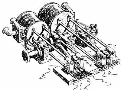The four cast iron blades of each of the twin propellers were bolted to their propeller hubs. The propeller shafts were each supported by three plumber blocks and were driven by double acting two cylinder simple engines. These horizontal engines were Maudsley's return connecting rod design with a relatively short two foot six inch stroke and large three foot six bore. Each piston drove its crosshead through either two or four connecting rods which were disposed above and below the crankshaft on each side of the crankwebs. It is presumed that crosshead mounting slippers ran in guides on the engine bed plates. From the crosshead pins the connecting rods led back to the crankpin journals thereby forming a relatively short engine but still with reasonably long connecting rods.