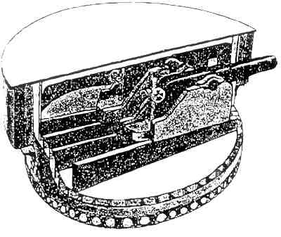 CERBERUS' main armament was four ten inch bore muzzle loaded rifled guns each weighing eighteen tons, two in each turret. Turrets were carried on substantial rollers set between roller paths beneath the periphery of the turrets - training was hydraulic. Indications are that most of the recoil of these guns was absorbed by a form of hydraulic(?) amortiser fitted between the sloping rails carrying the gun carriages. The remainder of recoil energy pushed the carriages up the slope until they were ultimately stopped by buffers and held in this position for reload which could now be accomplished from within the turret. |