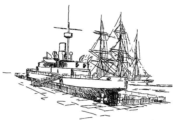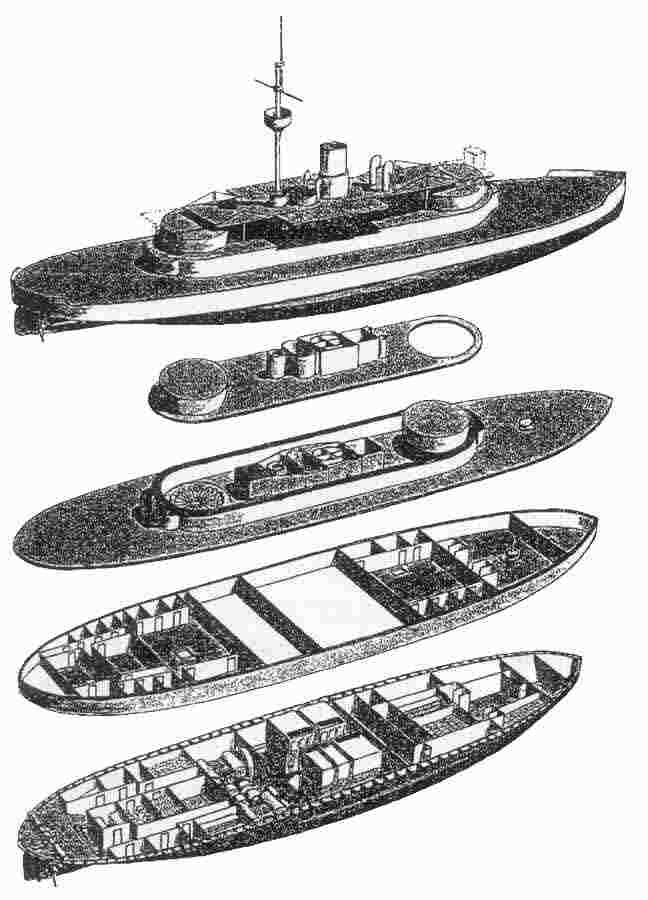 CERBERUS was the first of a line of Breastwork Monitors built in the U.K. in the 1870's and her design concepts were followed for major ironclad warships until the end of the nineteenth century: these concepts aimed to provide heavy seaborne fire power against shore targets but yet to present the minimum of target to enemy gunners. When on passage these ships would steam at a relatively light condition with maybe six feet of freeboard. On arrival at the bombardment area ballast tanks would be flooded until only a meer couple of feet of freeboard remained. Such target area as was then presented was protected by heavy armour on the ship's side, around the turret breastwork and on the turrets themselves.