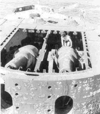 We are standing on the top of the Conning Tower (in 1968) with the Flying Deck completely gone. With the cover missing from the Aft Gun Turret we can see the two guns.
